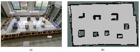 The experimental environment and a map model generated by a laser radar: (a) the experimental environment, and (b) the grid map generated by laser radar.