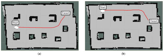 The EACI algorithm was implemented as a plugin and integrated into the move_base package, with configuration managed through the move_base_params.yaml parameter file. After defining the start points and endpoints set on the map, the robot can execute path planning using the proposed algorithm. As shown in Figure 33, the DDMR successfully navigated along the designated navigation route and reached the destination without encountering deadlock grids. This finding highlights the robot’s strong navigation capabilities and further validates the effectiveness of the algorithm in specialized environments.