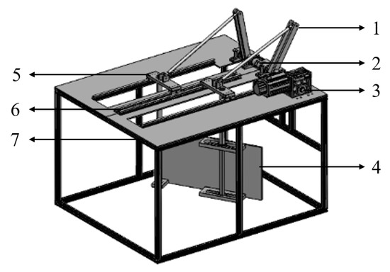 Schematic diagram of the crank-slider drive mechanism. (1. Double Crank 2. Coupling 3. Stepper Motor 4. Flapping Flat-Plate Hydrofoil 5. Slider 6. Slide Rail 7. Support Frame).
