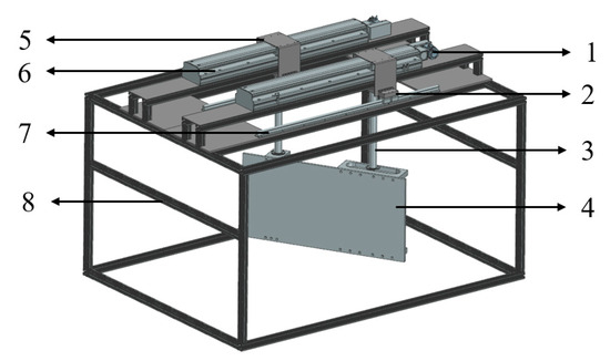 Schematic diagram of the synchronous belt drive mechanism. (1. Stepper Motor 2. Slider 3. Connecting Rod 4. Flapping Flat-Plate Hydrofoil 5. Slide Platform 6. Synchronous Belt Module 7. Slide Rail 8. Support Frame).