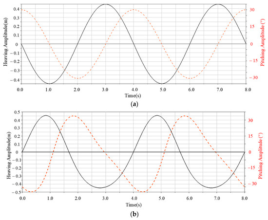 To study the impact of the flapping modes of the two devices’ flapping flat-plate hydrofoils on propulsion mechanisms and the influence of flow channel structure on propulsion efficiency, the parameter settings for each flapping mode computational model are as follows: heaving amplitude Hmax = 450 mm, pitching amplitude θmax = 30°, and phase difference Φ = −π/2. The selected parameters were determined based on previous studies and the actual design of the device.