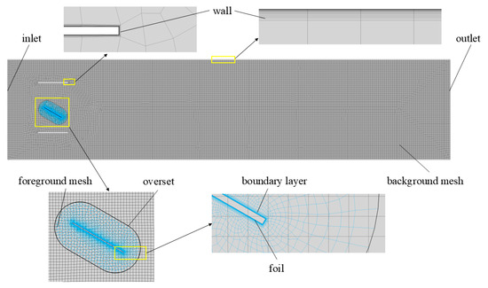 The turbulence modeling in this study is based on the Realizable k-ε model, which is effective in capturing complex flow dynamics, particularly in regions involving vortex shedding and near-wall effects. The outer layer of the foreground mesh is sized consistently with the background mesh to further ensure computational accuracy. Different turbulence models and wall functions impose varying Y+ requirements [29,30]. To accurately capture wall flow features and ensure computational stability, boundary layer meshes are deployed on the channel walls and hydrofoil surface. The first layer mesh height on the flapping flat-plate hydrofoil surface is set to 0.000046 mm, corresponding to a Y+ value of 1, which ensures that the boundary layer is well-resolved and the near-wall effects are captured accurately. This mesh configuration guarantees that the turbulence model effectively resolves the flow structures near the hydrofoil surface, which is critical for accurately simulating the flow characteristics in this study.