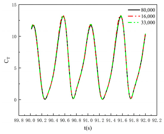 To verify grid independence, numerical simulations were performed with three different mesh sizes (10,000, 160,000, and 330,000 cells), with results shown in Figure 7. Comparative analysis revealed that the instantaneous thrust coefficient results are essentially consistent across the three mesh sizes. Considering the balance between computational efficiency and accuracy, a mesh of 160,000 cells was selected for further calculations. This mesh refinement study serves as a grid convergence analysis, confirming that the 160,000-cell mesh provides accurate and stable results for the hydrofoil thrust coefficient with deviations under 5% compared to finer grids.