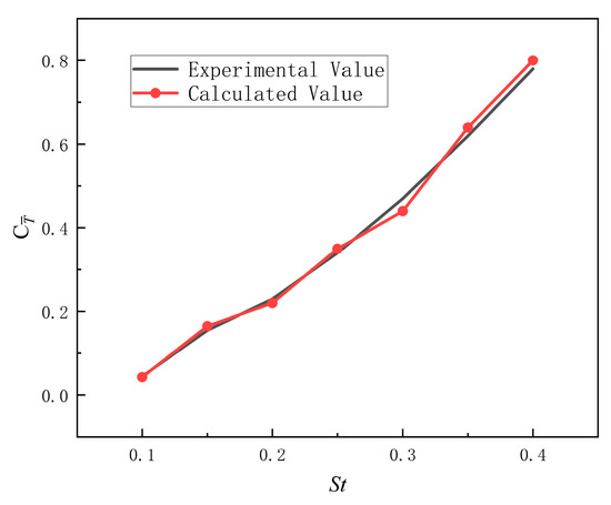 The simulation parameters were set to be consistent with the experimental conditions in the literature: bionic flapping wing chord length c = 0.1 m, inlet velocity U = 0.4 m/s, phase difference Φ = −π/2, heaving amplitude Amax = 0.075 m, and a maximum angle of attack of 20°. The numerical simulation results of the mean thrust coefficient of the flapping hydrofoil as a function of Strouhal numbers were compared with the experimental data from the literature. The results, shown in Figure 8, indicate that the numerical simulation results are in good agreement with the experimental data, confirming the accuracy and validity of the simulation method used in this study.