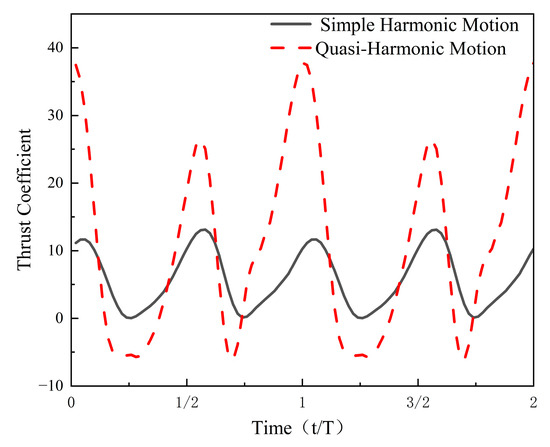 A comparison reveals that in quasi-harmonic motion, there are moments when the instantaneous thrust coefficient is negative, indicating that both thrust and drag are generated during the quasi-harmonic motion [34], whereas in simple harmonic motion, thrust is always generated in the direction of propulsion.