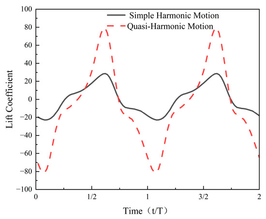 It can be observed that overall, the lift coefficients exhibit periodic fluctuations with one positive and one negative peak per cycle, typically occurring near the hydrofoil’s equilibrium position where the rate of change in angle of attack is greatest. Compared to the simple harmonic motion, which shows smooth and symmetric variations, the quasi-harmonic motion exhibits greater peak-to-peak amplitude, indicating more abrupt pitching behavior and increased flow asymmetry. Despite these differences, the lift coefficients for both modes are symmetrically distributed over the cycle, resulting in a mean value close to zero.