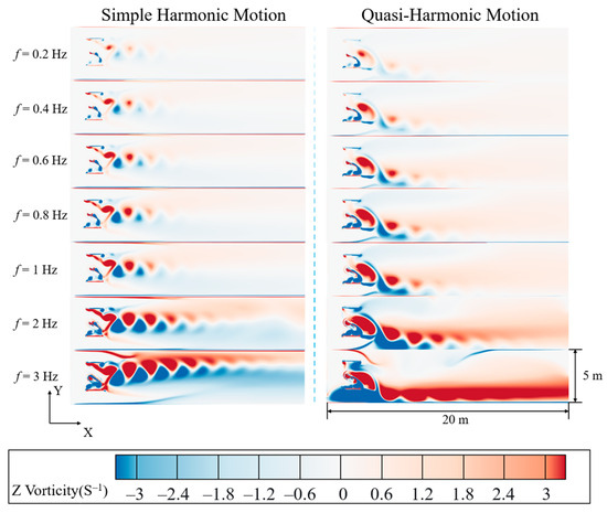 It is noteworthy that under simple harmonic motion at low frequency, the wake vortices are relatively symmetric, forming a reverse Kármán vortex street aligned along the centerline of the flow field. However, at 3 Hz, the increased flapping speed of the flat-plate hydrofoil causes a more rapid change in the angle of attack, altering the direction of lift exerted by the fluid on the hydrofoil. The resulting upward average lift at the tail leads to an upward shift of the entire vortex street. Under quasi-harmonic motion, the trailing vortices of the flapping flat-plate hydrofoil exhibit a downward deflection at all frequencies, and this downward shift becomes more pronounced as the frequency increases. This is due to the fact that quasi-harmonic flapping is driven by a crank-slider mechanism, which inherently exhibits a quick-return characteristic. During the upward stroke, the flapping hydrofoil is in the working phase, moving more slowly and producing relatively uniform fluid disturbances. During the downward stroke, which serves as the return phase, the flapping flat-plate hydrofoil accelerates, producing greater instantaneous thrust. This increased thrust induces significant asymmetry in the fluid motion, thereby influencing the formation and evolution of the vortex street.