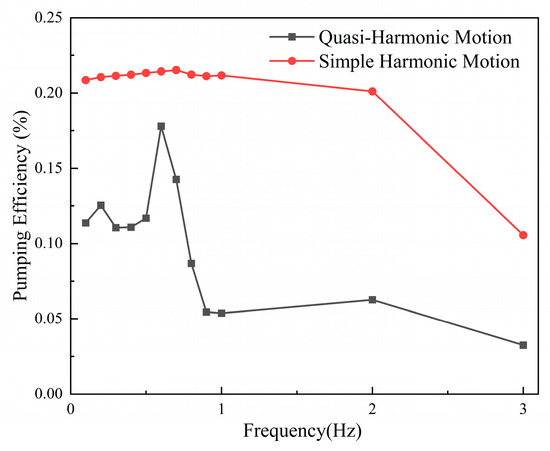 - Simple harmonic motion maintains a relatively high pumping efficiency overall, reaching a maximum of 21.5% at a flapping frequency of 0.7 Hz. In contrast, the pumping efficiency of quasi-harmonic motion fluctuates more significantly across frequencies, with a peak of 17.8% at 0.6 Hz. At this frequency, the pumping efficiency of simple harmonic motion is still 20.2% higher than the peak value of quasi-harmonic motion.