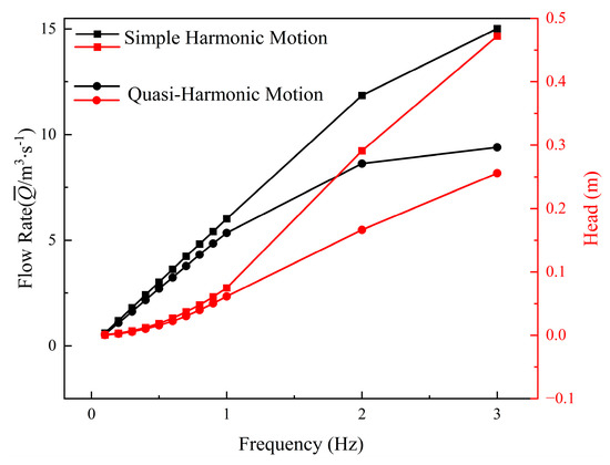 It can be observed that at low frequencies, the flow rate of the flapping flat-plate hydrofoil is approximately proportional to the flapping frequency, while the head is roughly proportional to the square of the frequency. At higher frequencies, both simple harmonic and quasi-harmonic motions are affected by vortex deflection, which in turn impacts the flow rate and head.