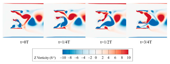 Figure 14 shows the vorticity contour plots at different time steps for a flapping frequency of 1 Hz. It can be observed that during the periodic motion of the flapping flat-plate hydrofoil, shear layer separation at the upstream end of the flow channel induces localized vortices that gradually strengthen. These vortices interact with the primary vortices generated by the hydrofoil itself, enhancing the wake structure behind the hydrofoil and ultimately forming an alternating reverse Kármán vortex street at the downstream end of the channel.