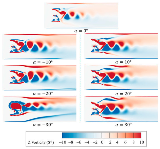 Overall, outlet angles within the range of α = −10° to 10° help maintain wake concentration and the formation of high-speed wake. In contrast, larger negative or positive angles may induce localized recirculation or flow deflection, affecting velocity stability. This result is corroborated by the wake deflection and vortex asymmetry observed in the vorticity contour plots.