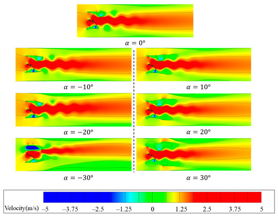 In contrast, at a larger negative angle of α = −30°, a distinct localized recirculation region forms above the flapping flat-plate hydrofoil, indicating that the negative tilt of the channel outlet causes severe flow separation and induces localized reverse flow. The presence of this recirculation region significantly disrupts the uniformity of the velocity field and causes a deflection of the wake structure. Furthermore, at this angle, the velocity gradient distribution at the outlet becomes more complex, with an enhanced transition zone between high-speed and low-speed regions, causing a deflection in the wake direction, which further affects the overall wake structure and propulsion performance.