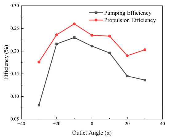 It can be observed from the figure that pumping efficiency and propulsion efficiency show a positive correlation in overall trend, with pumping efficiency slightly lower than propulsion efficiency. As the outlet angle increases, both propulsion and pumping efficiency first increase and then decrease. From the efficiency analysis, both pumping efficiency and propulsion efficiency reach their peak values at an outlet angle of −10°. Compared to an outlet angle of 0°, the −10° angle results in an 8.5% increase in pumping efficiency and a 10.2% increase in propulsion efficiency, indicating that a moderate negative angle can enhance fluid propulsion performance. This finding is consistent with previous analyses of vorticity and velocity contours, where the flow at the channel outlet remains stable within this angle range, with well-organized vortex structures and moderate shear layer separation, favoring the continuity and directional coherence of the wake.