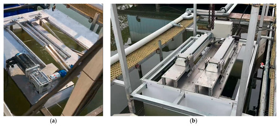 To verify the accuracy of the numerical simulations for different flapping modes of the flat-plate hydrofoil, physical prototypes were fabricated based on the previously defined parameters and tested in the experimental flume at Zhejiang Hengze Ecological Technology Co., Ltd., Hangzhou, Zhejiang Province, China. The physical tests were conducted in a rectangular flume with dimensions of 5 m × 20 m × 2 m. Importantly, the inlet velocity was set to 0 m/s, meaning there was no external forced flow in the system. Instead, the flow was generated entirely by the motion of the flapping hydrofoil, with the system relying on the thrust and lift forces induced by the hydrofoil’s oscillations to drive the flow through the channel. To minimize the influence of the free surface during testing, the flow velocity sensor was positioned at the same depth as the midsection of the hydrofoil. The flapping flat-plate hydrofoil device and the crank-slider mechanism were placed at the inlet, as shown in Figure 18.
