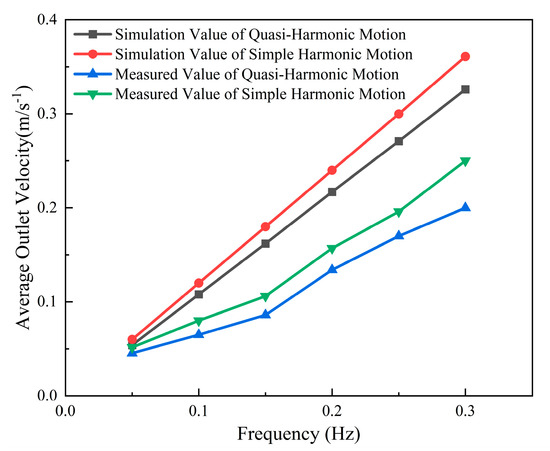 As shown in Figure 19, all four curves exhibit a linear increasing trend with flapping frequency, indicating a positive correlation between frequency and flow velocity enhancement. At the same frequency, both the simulated and experimental flow velocities of the simple harmonic motion are consistently higher than those of the quasi-harmonic motion. The simulation trends show good agreement with the experimental results. This further confirms that simple harmonic motion is more effective in enhancing pumping performance.