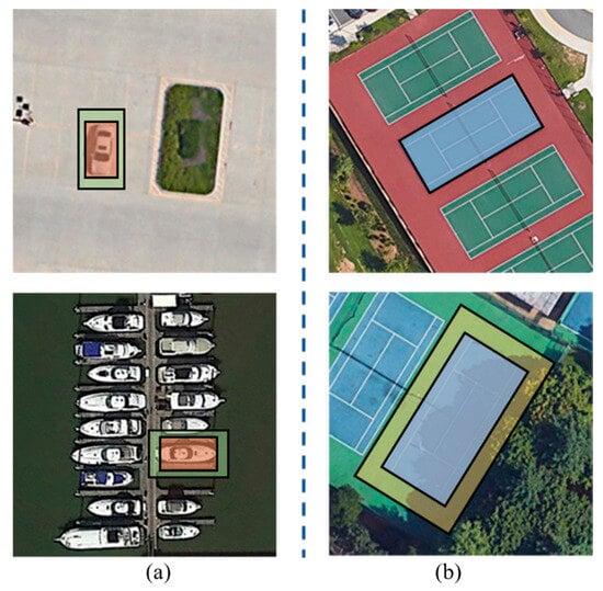 Figure 1. Successfully detecting remote sensing objects requires appropriate contextual information. (a) cars vs. ships—small objects need local background; (b) occluded objects need long-range contextual information. - Correctly detecting different objects requires varying effective receptive field sizes. Different objects have different sizes, degrees of occlusion, and backdrop complexity, leading to varying necessary receptive field sizes for successful detection. For instance, in unobstructed scenes such as aircraft, swimming pools, and tennis courts, relatively smaller receptive fields are required. However, at intersections, bridges, docks, etc., extremely large receptive fields are required because these types of objects often have large sizes and aspect ratios and are obscured by other objects, making accurate recognition challenging. As illustrated in Figure 1b, the tennis court in the upper image is clear and unobstructed, requiring only a smaller receptive field for accurate recognition. However, recognizing the tennis court in the lower image requires a broader receptive field, as the tennis court is largely obscured by tree shadows, making recognition based on appearance alone challenging.