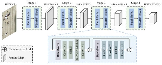 Although numerous oriented object detectors for remote sensing imagery have made significant progress, the prevailing methods still rely on ResNet [16] as the backbone network. However, this design does not fully address the specific requirements of remote sensing images. First, the basic design of ResNet assumes that the boundaries between objects and backgrounds in images are relatively clear and that image features can typically be sufficiently expressed within a local context. However, remote sensing images are typically captured from a high-resolution bird’s-eye view, resulting in the presence of numerous small-sized or occluded objects, the detection of which often requires a broader contextual range and more detailed structural information. While ResNet is capable of feature extraction through deep networks, its convolution operations are confined to a local receptive field, making it difficult to capture long-range contextual information at early stages. While convolutional layers can capture some structural information, their response to small-scale and high-frequency structures is relatively weak. Due to the large stride in pooling operations and convolutional layers, detailed information (e.g., the texture and edges of tiny objects) may be lost or blurred. This makes it difficult for ResNet to capture more detailed structural information. Remote sensing images are often affected by various types of noise, making the consideration of noise robustness in detectors essential for practical applications. However, the ResNet design does not specifically account for noise interference. Particularly, when large amounts of noise are present in the image, the network may incorrectly recognize noisy regions as valid features, thereby affecting detection accuracy. Therefore, designing a backbone network specifically tailored for remote sensing image detection would contribute to improved detection accuracy.