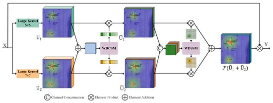 where and are 1 × 1 convolutions, the purpose is to reduce the dimensionality of feature maps for each branch and allow mixing of features from different channels. Due to the multi-branch structure generating a series of feature maps, causing a significant increase in computational resource requirements, we reduce the channel dimension of each group of feature maps by half to mitigate computational complexity. In the following section, we propose the WDSSM and WDCSM. This mechanism dynamically selects suitable receptive fields for various objects while also enhancing the noise robustness of the network.