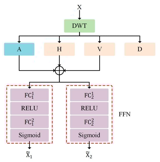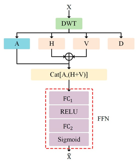 Selection of Wavelet Domain sub-bands after 2D Discrete Wavelet Transform. Figure 3 illustrates the sub-bands resulting from the 2-D Discrete Wavelet Transform. The four components decomposed after the wavelet transform are the low-frequency component , the horizontal high-frequency component , the vertical high-frequency component , and the diagonal high-frequency component . It is readily apparent that the low-frequency component primarily preserves the core structural information of the image, filtering out random noise and redundant information. The high-frequency components harbor more detailed information and noise, where the diagonal high-frequency component exhibits lower information content and is predominantly composed of noise signals. Thus, selecting appropriate sub-bands significantly influences network performance. We conducted experiments to determine the optimal selection of frequency domain sub-bands, and the corresponding ablation study results are presented in Table 4. The results of the ablation studies indicate that the combination pattern of and both improve network performance; however, the combination pattern reduces network performance, as is primarily composed of noise signals, and noise has a marked effect on network performance. When the combination pattern of (A+H+V) is selected, the test results reach the optimum.