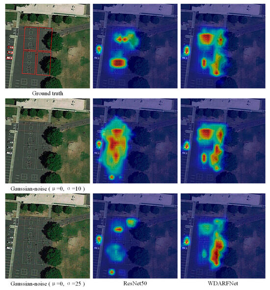 Noise-robustness. Convolutional neural networks are generally susceptible to noise interference. As feature maps propagate through deeper layers of the network, the noise is amplified successively, resulting in incorrect final predictions. To address the aforementioned issue, we propose a Wavelet Domain denoising strategy to enhance the network’s noise robustness. Subsequently, ablation experiments were conducted to verify the effectiveness of WDARFNet. In the training stage, ResNet50 and WDARFNet were used as backbone networks to train models on the clean DIOR-R training set for 12 epochs, respectively. In the testing stage, the clean DIOR-R testing set, and the Gaussian-noise-added DIOR-R testing set were selected as test datasets to evaluate ResNet-50 and WDARFNet, respectively. The corresponding ablation study results are presented in Table 3. The ablation study results show that after adding Gaussian noise with a mean () of 0 and a standard deviation () of 10 to the testing set, the mAP using ResNet50 as the backbone network drastically fell to 46.52%, which is a significant decrease of 13.80% compared to the results on the clean test set. When using the WDARFNet backbone network, the mAP fell to 56.61%, which is only a decrease of 8.72% compared to that on the clean test set. After adding Gaussian noise with and to the test set, the mAP using ResNet50 as the backbone network drastically fell to 31.18%, whereas the mAP using WDARFNet as the backbone network is 48.19%. This indicates that WDARFNet can effectively maintain object structure and suppress noise during network inference. Figure 8 presents two examples of the heatmaps for the well-trained ResNet50 and WDARFNet models, using noisy images as input. The first row displays the clean image and the heatmaps of ResNet50 and WDARFNet. The second and third rows show the images with added Gaussian noise (μ = 0, σ = 10) and (μ = 0, σ = 25), respectively, along with the heatmaps generated by the two networks. These two examples demonstrate that the original CNN has difficulty suppressing noise, whereas WDARFNet can effectively suppress noise and concentrates its attention primarily on or around the object during the inference process. Consequently, WDARFNet achieves superior detection accuracy in various challenging situations.