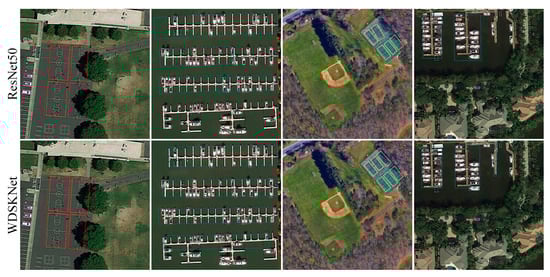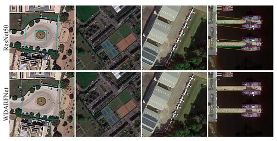 Visualization analysis of the predicted results on DIOR-R. The upper row displays the results of ResNet50, which serves as the baseline, while the bottom row displays the results of WDARFNet.