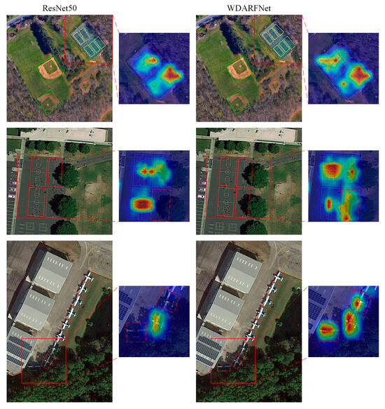 Figure 11 displays the heatmaps of our method and the baseline for detecting objects obscured by shadows, with the first and third columns illustrating the test results of ResNet50 and WDARFNet, respectively. The second and fourth columns depict the heatmaps of partially obscured objects. In the baseball court detection task, the heatmap generated by WDARFNet focuses more precisely on the target area, with more accurate bounding box coverage. In the basketball court detection task, the heatmap generated by WDARFNet demonstrates greater attention to densely arranged objects obscured by shadows and effectively separates tightly distributed objects, avoiding overlapping, and false negatives in the bounding boxes. In the airplane detection task, WDARFNet not only accurately locates individual aircraft targets but also effectively reduces interference from shadows and backgrounds, with the generated heatmap focusing on the core regions of the objects, further improving detection accuracy.