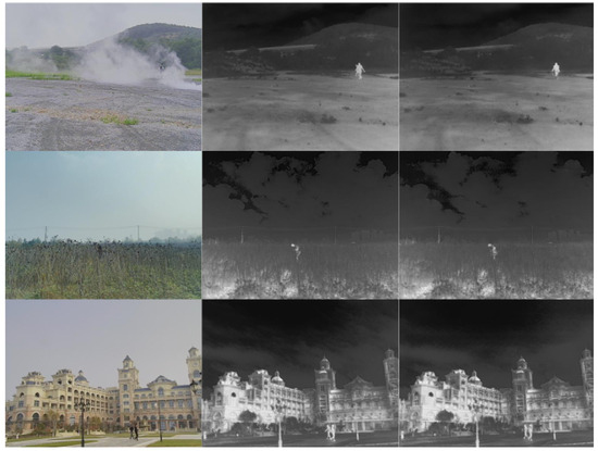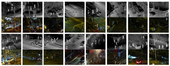 Using the aforementioned methods, a dataset for image fusion was constructed. It contains over 4000 pairs of visible and infrared images, featuring targets such as pedestrians, cars, and buses. The images cover various weather conditions, including daytime, dusk, and nighttime, as well as diverse backgrounds such as forest and urban scenes. The acquisition angles also vary, including vehicle-mounted frontal views, stationary frontal views, and overhead surveillance perspectives. The partial pictures are shown in Figure 3. The first row of images is infrared images, and the second row is visible-light images.