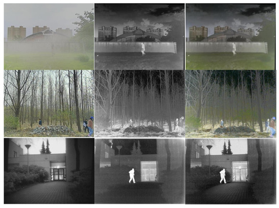 We trained a Pix2Pix [24] model to translate visible-light images into synthetic infrared-style images using a conditional GAN framework. After training, the generator produces thermal-like outputs that resemble real infrared images in appearance and structure. This approach addresses the lack of paired multimodal data and supports downstream tasks like target detection. As illustrated in Figure 2, each row shows a visible image (left), a real infrared image (middle), and a generated infrared-style image (right), enabling direct comparison. The selected scenes such as foggy weather, grasslands, and urban areas, reflect typical conditions in civilian surveillance. The results show that Pix2Pix effectively captures thermal patterns and scene structure, proving useful for data augmentation in IR-VIS fusion.