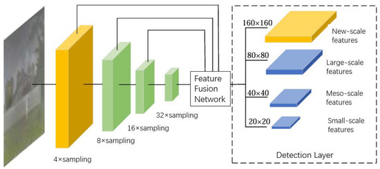 To enhance small-target detection, a 4× downsampled feature map is introduced into the feature fusion network, generating a new 160 × 160 scale feature. Although this feature map has a smaller receptive field and less semantic information, it retains more spatial detail, making it beneficial for locating small objects.