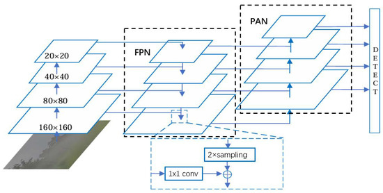 Deep feature maps obtained through multiple downsamplings contain rich semantic information but may lose fine details and precise location cues. In contrast, shallow feature maps preserve detailed spatial information but are more susceptible to noise and lack semantic understanding. To leverage the strengths of both, the improved model adopts a feature fusion structure based on FPN and PAN, as shown in Figure 8. FPN enhances semantic propagation from deep to shallow layers, while PAN improves the transfer of location information from shallow to deep layers. This fusion strategy enables the network to extract more robust and discriminative features across scales, effectively improving small-object detection performance.