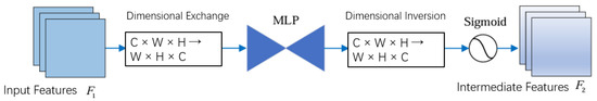 The feature map input to the network will pass through two attention modules and successively. first passes through to obtain , and then passes through to obtain the optimized feature . The calculation process is shown in Equations (5) and (6).
