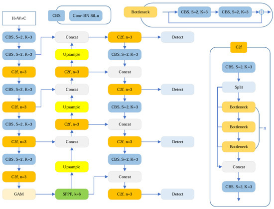 The YOLOv8 backbone takes 640 × 640 images as input and generates three feature maps through 8×, 16×, and 32× downsampling, corresponding to resolutions of 80 × 80, 40 × 40, and 20 × 20. According to the Feature Pyramid Network (FPN) principle, deeper layers capture rich semantic information and are suitable for large-object detection, but repeated downsampling leads to loss of spatial details, making small-object detection more difficult. In contrast, shallow layers retain finer location information and are better for detecting small targets.
