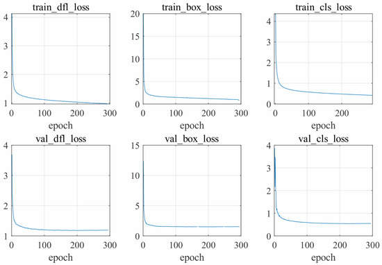 The dataset is divided into training, validation, and test sets in a 7:2:1 ratio. During model training, the batch size is set to 32, and the number of training epochs is set to 300. Stochastic Gradient Descent (SGD) is used as the optimizer, with an initial learning rate of 0.01. An early stopping mechanism is applied to prevent overfitting by evaluating model performance on the validation set after each epoch. If multiple consecutive evaluations show no significant improvement, training is halted to avoid overfitting. In this case, training stopped early at the 295th epoch. The loss variation curves are presented in Figure 18, illustrating the following from left to right: Distribution Focal Loss (DFL) improves localization precision by modeling bounding box coordinates as discrete distributions; bounding box loss evaluates the regression accuracy, often using IoU-based metrics; classification loss measures the discrepancy between predicted and true class labels, typically via cross-entropy or focal loss.