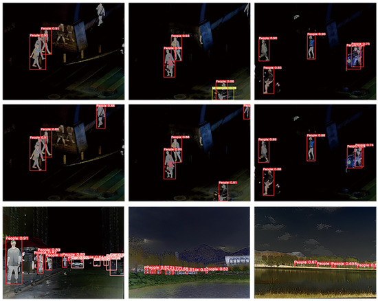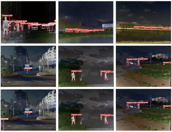 In safety-critical domains such as autonomous driving or security surveillance, even a marginal gain in recall or localization performance can significantly enhance system robustness, especially when the risk of missing a small or partially hidden target may result in severe consequences. We further analyzed the detection outputs and found that fused images are more effective in identifying occluded or low-contrast targets. To illustrate these cases, qualitative comparisons have been included in Figure 21. Seven groups of images were selected from visible-light images, infrared images, and fused images for detection effect comparison. In each group, from left to right, the detection results of visible-light images, infrared images, and fused images are shown.