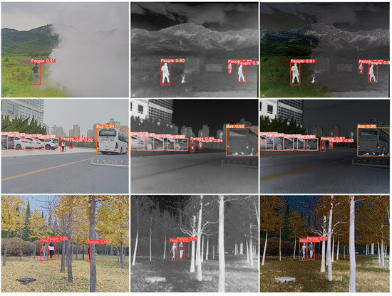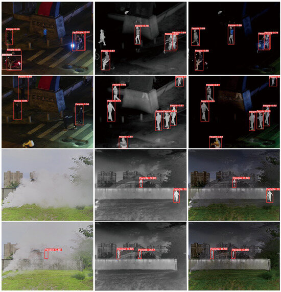 The third, fourth, and fifth groups depict smoke-filled environments, where heavy smoke significantly degrades the quality of visible-light images, obscuring the targets behind it. In contrast, the fused images are able to successfully detect all targets that are missed by the visible-light modality.