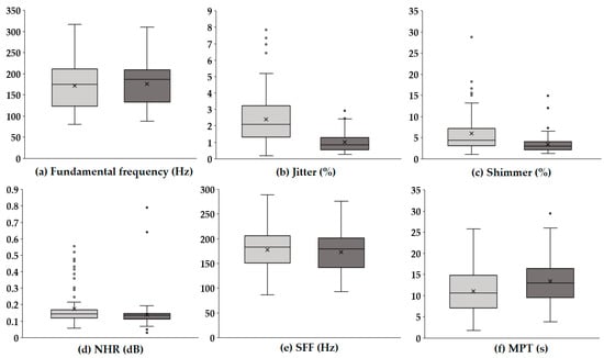 Figure 1 presents boxplots illustrating the changes in key acoustic parameters before and after voice therapy. In each panel, the light gray box represents the values prior to voice therapy, while the dark gray box indicates values following voice therapy.
