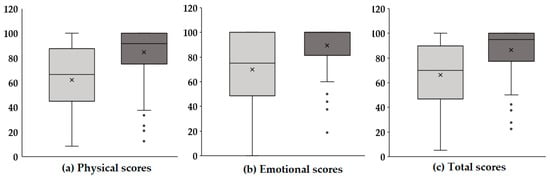 Figure 2 presents boxplots illustrating the changes in physical, emotional, and total scores before and after voice therapy. In each panel, the light gray box represents pre-therapy scores, while the dark gray box indicates post-therapy scores. Panel (a) displays the physical scores, which reflect functional aspects of the vocal mechanism and physical discomfort related to voice disorders. After therapy, there was a slight upward trend in these scores, suggesting that voice therapy may have contributed to improvements in vocal function and a reduction in physical strain associated with phonation. Although the increase was modest, it implies potential therapeutic benefits in the physical domain, warranting further statistical verification. Panel (b) shows the emotional scores, which assess the psychological and emotional burden caused by voice disorders, including anxiety, frustration, and social withdrawal. The post-therapy scores exhibited a more pronounced increase compared with the physical domain. This suggests that voice therapy had a notable positive impact on the emotional well-being of the participants. This improvement in emotional scores may be attributed to enhanced vocal function, leading to increased confidence in communication and reduced psychological distress. Panel (c) presents the total scores, which represent the combined impact across both the physical and emotional domains. A significant increase in total scores was observed after therapy, indicating a comprehensive improvement in voice-related quality of life. The changes in score distributions, as visualized through the boxplots, reinforce the therapeutic effect not only on the objective functional measures but also on the patients’ subjective experiences and perceptions. In summary, the results suggest that voice therapy provides multidimensional benefits. Beyond measurable acoustic improvements, it contributes to enhanced physical comfort, emotional stability, and overall quality of life in individuals with voice disorders.