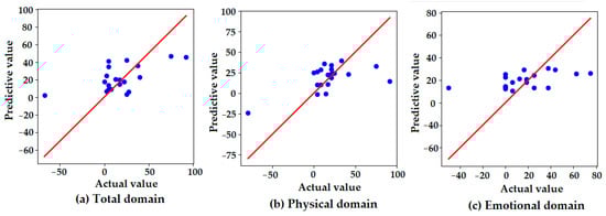 Scatter plots of the actual versus predicted values for the K-VRQOL score improvements in the (a) total, (b) physical, and (c) emotional domains. Each point represents an individual case. The red diagonal line indicates the line of perfect prediction (y = x), where predicted values would exactly match actual observed improvements. The proximity of the points to this line reflects the predictive accuracy of the model in each domain.
