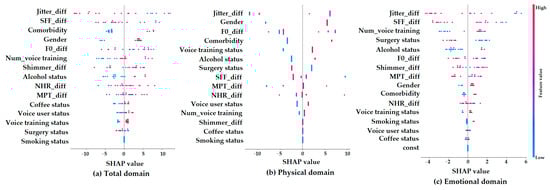 In the total domain (a), the features that most strongly influenced the model’s predictions were Jitter_diff, SFF_diff, comorbidity, gender, and F0_diff. Specifically, the lower values of Jitter_diff and SFF_diff, which reflect more stable and regular vocal signals, were associated with greater predicted improvements in quality of life. This suggests that improvements in vocal stability and clarity are important factors for better overall outcomes. Additionally, being female and having comorbidities were also linked to greater predicted improvements. For the physical domain (b), the most important predictors were Jitter_diff, gender, comorbidity, and voice training status. Among these, Jitter_diff had the greatest impact, highlighting the key role of acoustic stability in improving the physical aspects of voice-related quality of life. In contrast, the emotional domain (c) showed SHAP values that were more scattered and had a narrower range. This indicates that individual features had weaker and less consistent effects on the model’s predictions in this domain. While factors such as Jitter_diff, SFF_diff, the number of voice training sessions, surgery status, and alcohol status had some influence, their overall impact was limited and more difficult to interpret. This pattern suggests that predicting emotional improvements in voice-related quality of life is more complex and may depend on factors not included in the current model. Overall, these results indicate that acoustic variables are highly important for predicting outcomes in the total and physical domains of K-VRQOL, while emotional outcomes are likely influenced by more subjective and diverse factors that are not fully captured by the present analysis.