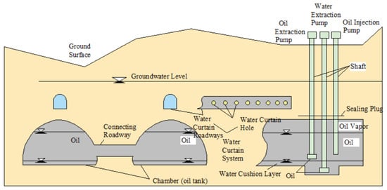 Under the “dual carbon” policy, China’s energy structure is undergoing continuous adjustments, leading to the closure of numerous mines [1,2,3]. Consequently, the development and utilization of abandoned mine spaces have become a research hotspot in China’s mining industry [4,5]. Repurposing deep abandoned mines into underground oil storage facilities promotes resource recycling [6,7]. As shown in Figure 1, an underground water-sealed oil storage is mainly composed of three parts: the oil storage system, the vertical injection and extraction system, and the water curtain system. Among them, the underground oil storage system is the core component and key carrier for underground oil storage [8,9]. The oil storage chambers are typically reinforced and modified from roadways or chambers within abandoned mines, with a water cushion layer established at the lower part of the chamber to implement water-sealed oil storage. The surrounding rock of the oil storage chamber will be soaked in oil–water for a long time [10]. However, before being abandoned, underground roadways experience stress disturbances from mining activities and overburdened loads, which damage the surrounding rock [11]. When subjected to soaking in an oil–water mixture, the stability of the damaged rock becomes difficult to ensure. Therefore, investigating the mechanical behavior of the surrounding rock under different liquid content conditions is of great significance for the construction of underground oil storage facilities in abandoned mines.