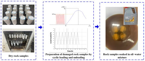 A review of previous studies indicates that most research on fluid–rock interactions has focused on analyzing rock structural changes, failure modes, mechanical properties, and damage model establishment under soaking in single liquid (water) or cyclic wetting–drying conditions. However, the effects of oil–water mixtures on rock composition, fundamental mechanical properties, and the damage mechanism of damaged rock have not been systematically analyzed. At present, the research on the interaction between oil–water mixture and rock is mainly found in petroleum engineering. The research content focuses on the oil–water relative permeability curve, oil displacement technology, the oil–water occurrence state inside rock, etc., and the research results have been mostly used to increase reservoir permeability [17,18]. There are few contents related to the influence of oil–water mixture on the structure of rock components, but it is clear that the oil–water mixture will have a series of physical and chemical effects on the rock, such as the exchange of the ions on the surface of minerals and the ions in the mixture. The Ca2+ on the surface of the rock and the Na+ in the mixture can undergo significant ion exchange [19]. In addition, the behavior of expansion, dissolution, and precipitation of sensitive minerals in rocks after interaction with an oil–water mixture will change the internal structure and pore type of the rocks, thus affecting the physical and mechanical properties of the rocks [20]. The internal pores of the pre-damaged rock are more developed, and the contact area between the microstructure of the rock and the oil–water mixture is larger. At the same time, it also provides more active space for oil–water displacement, and ion exchange and rock structure change more frequently [21]. Therefore, the change of rock properties is more difficult to predict than that of single liquid (water) immersion.