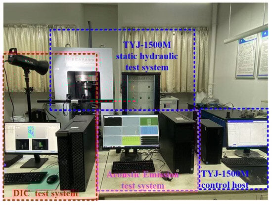 The uniaxial compression tests were conducted using a TYJ-1500M static hydraulic testing system, which features a servo-controlled hydraulic system with a rated load capacity of 1500 kN, a stress accuracy of 0.5% of the applied force, and a strain accuracy of 0.5% (Figure 3). The displacement loading mode was selected in the uniaxial compressive strength test, the displacement rate was set to 0.002 mm/s, the preload was set to 0.05 kN, and the displacement was cleared to zero after the sample was in complete contact with the pressure plate.
