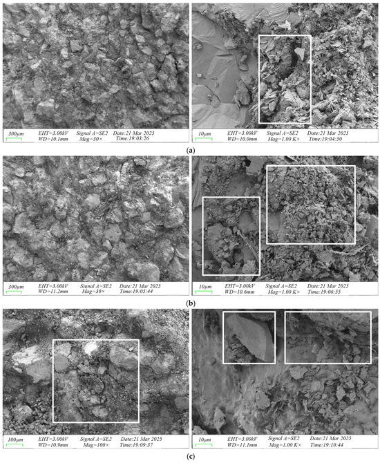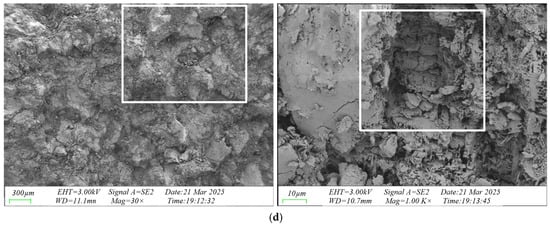 Figure 5 presents SEM images of damaged rock samples after different soaking times. The surface of the dried damaged rock sample appears smooth, with distinct particle characteristics. However, due to the effects of loading and unloading, microcracks are present within the structure. After 8 h of soaking, the rock surface remains relatively smooth. Due to oil–water soaking, pits begin to appear on the surface, and the particle size significantly decreases, exhibiting a flocculent structure. This indicates that the hydrophilic substances within the sample interact with the oil–water mixture, initiating structural changes in the rock. After 16 h of soaking, microcracks and holes can be seen on the surface of the rock samples under a low magnification microscope, while deep cracks and block spalling appear under a high magnification microscope. After 24 h of soaking, the number and depth of holes on the surface of the rock sample increase further under the low magnification microscope. Under the high magnification microscope, holes left after the spalling of the block appear, more microcracks are distributed around the holes, and the characteristics of flocs below and on the right side of the holes are obvious.