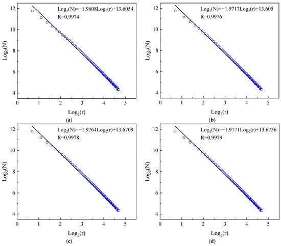 Fractal dimensions of SEM images at different soaking times: (a) 0 h, (b) 8 h, (c) 16 h, (d) 24 h.