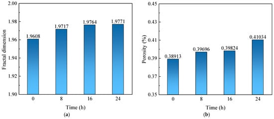 As illustrated in Figure 7, both the fractal dimension and porosity of the damaged rock samples increased with prolonged soaking time.