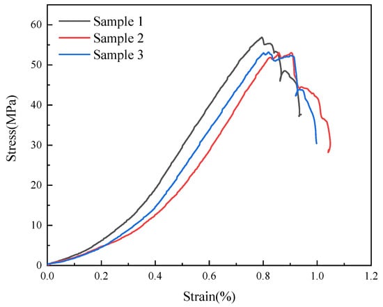 Cyclic loading and unloading tests are required to prepare initial damaged coal samples. In order to provide a stress calibration basis for the cyclic loading and unloading test, the uniaxial compressive strength of the dried intact rock sample was tested. Three intact specimens were selected for uniaxial compression testing, with the results shown in Figure 8. The stress–strain curves of the three specimens exhibit similar trends, with peak strengths of 57.1 MPa, 53.2 MPa, and 53.1 MPa, respectively, yielding an average compressive strength of 54.5 MPa. A stress level of 60% of the average compressive strength (32.7 MPa) was set as the upper limit for cyclic loading and unloading, and the specimens were subjected to eight cycles to induce damage.