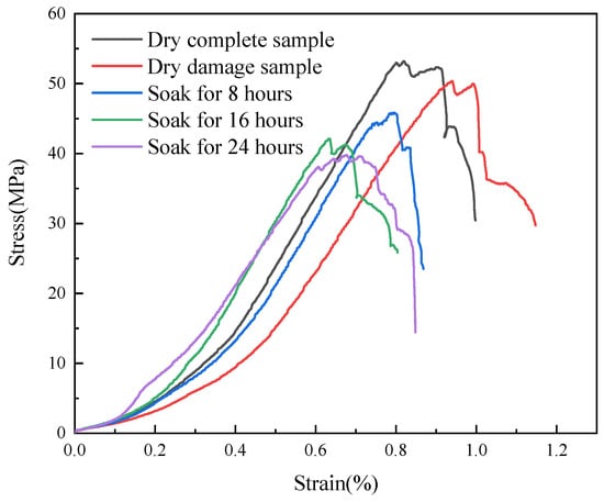 The uniaxial compression stress–strain curves of damaged specimens with different soaking times are shown in Figure 9, with the stress–strain curve of the intact dried specimen (black) included for comparison. First, the mechanical differences between the intact dried specimen and the damaged dried specimen were analyzed. The red curve in the figure represents the uniaxial compression curve of the damaged dried specimen. Compared to the intact dried specimen, the strain required during the compression phase before the peak is noticeably higher. The intact dried specimen ends the compaction phase at a strain of 0.37%, whereas the damaged dried specimen ends at 0.49%. The peak strength also decreases from 53.1 MPa to 50.4 MPa, a reduction of 5.1%. The post-peak stress curves of both specimens drop nearly vertically, but the damaged dried specimen exhibits more pronounced plastic characteristics, with a residual strength of 35.8 MPa, lower than the 43.6 MPa of the intact dried specimen. These results indicate that the loading and unloading cycles alter the internal structure of the rock and weaken its mechanical properties. Under stress, new fractures develop inside the intact rock, and the presence of these cracks reduces the compressive strength, residual strength, and other mechanical properties, which is unfavorable for the stability of oil storage spaces.