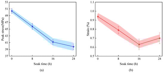 (a) Relationship between compressive strength and soaking time, (b) relationship between peak strain and soaking time.
