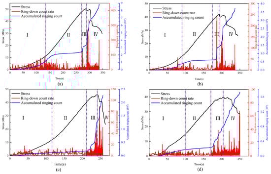 From the stress–time curves in Figure 11, it can be observed that the stress change of each rock sample can be divided into four stages: compaction stage (I), elastic stage (II), yielding stage (III), and failure stage (IV). These stages are consistent with the conventional classification of uniaxial compression curves for rocks. However, due to the varying soaking times of the damaged rock samples, the AE characteristics observed during each stage are different. The following is a comprehensive analysis of the AE characteristics of the rock samples at each stage, based on the evolution of stress, AE ringing count rate, and cumulative ringing count.