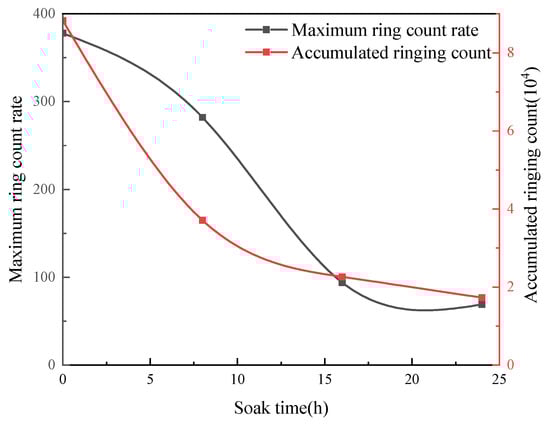 Figure 12 shows the relationship between the maximum AE ringing count rate and the cumulative ringing count at failure with soaking time. As the soaking time increases, both the maximum AE ringing count rate and the cumulative AE ringing count at failure decrease. For the dry sample, the maximum AE ringing count rate reaches 378 counts, and the cumulative count is 88,279 counts. For the sample soaked for 8 h, the maximum AE ringing count rate is 282 counts, and the cumulative count is 37,109 counts. For the sample soaked for 16 h, the maximum AE ringing count rate is 94 counts, and the cumulative count is 22,614 counts. For the sample soaked for 24 h, the maximum AE ringing count rate is 69 counts, and the cumulative count is 17,288 counts. Compared to the dry sample, these parameters are reduced by 81.7% and 80.4%, respectively. This indicates that the “water–rock interaction” weakens the mechanical strength of the rock, and the oil–water mixture has a significant impact on the AE characteristics during the uniaxial compression process.